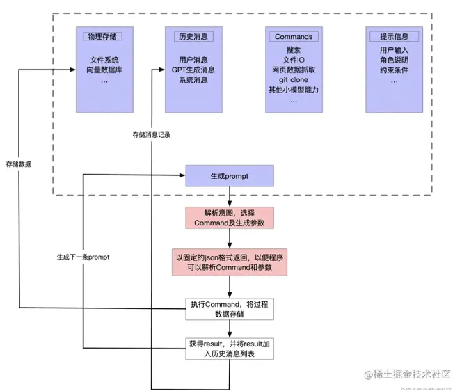 即 Auto GPT 根据设定的目标和任务以及存储在数据库中的数据(历史),不断为 GPT-4 生成合适的提示。