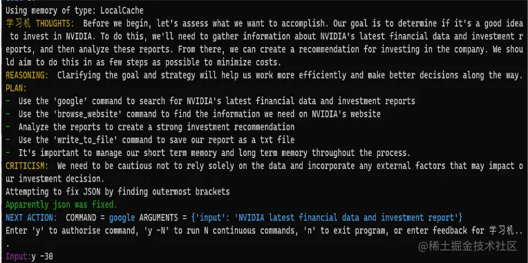AutoGPT 遵循thoughts、reasoning、plan和criticism的过程,给出一个有条理的、可实施的行动方案,并请求进行行动。