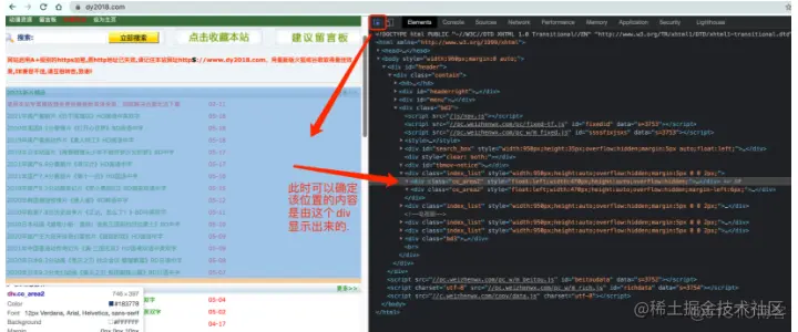 在Elements中我们可以使用左上角的小箭头.可以直观的看到浏览器中每一块位置对应的当前html状况. 还是很贴心的.