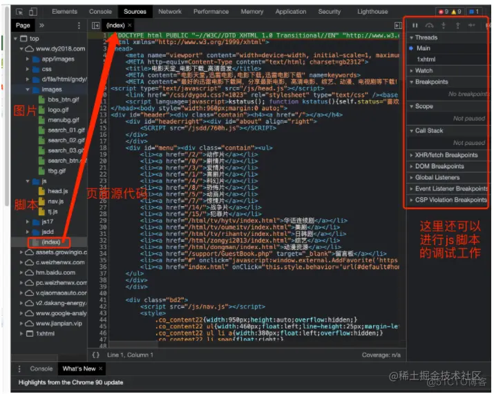 第三个窗口, Source, 这里能看到该网页打开时加载的所有内容. 包括页面源代码. 脚本. 样式, 图片等等全部内容.