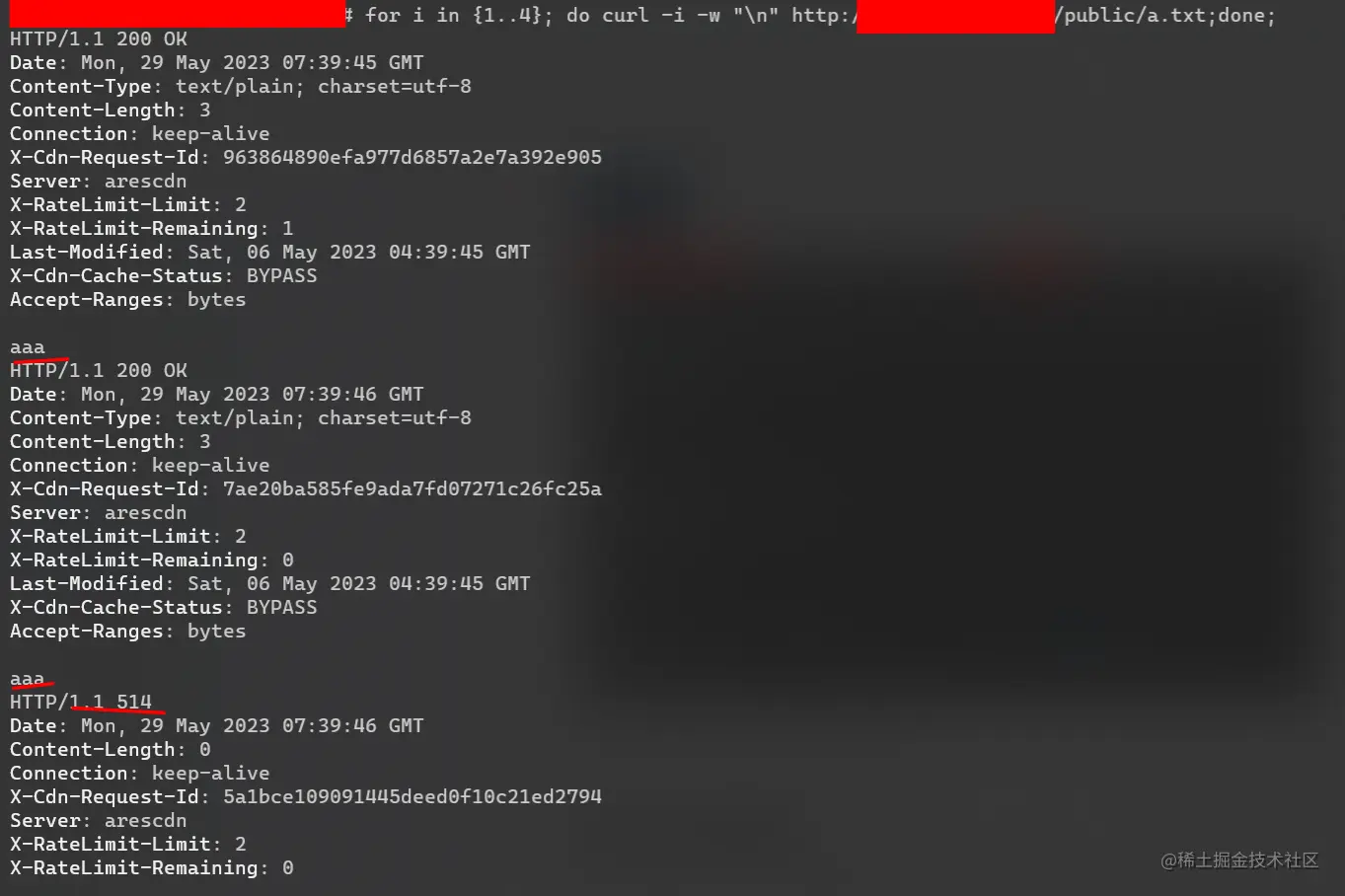我们配置了每个ip每秒只能访问两次,然后访问四次,可以看到只能访问两次