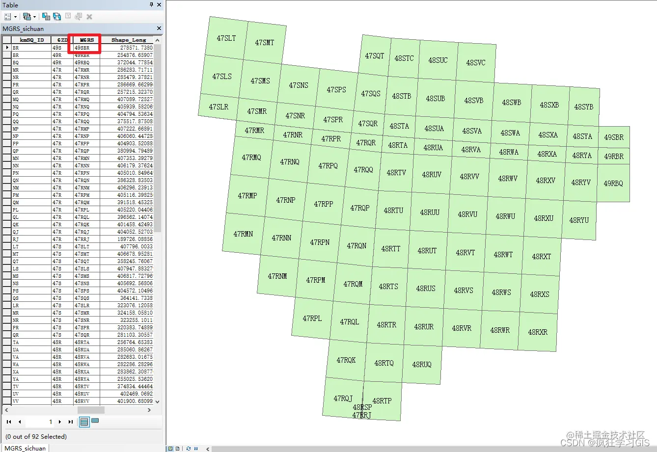 其中,矢量图层上的标签(Label)就是所需的遥感影像的分幅条带号;且这一矢量要素的属性表中,有具体每一个分幅条带号的具体字段(如上图红色方框所示的那一列)。