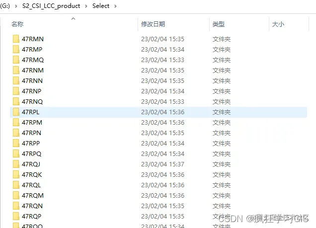 运行上述代码,最终我们得到的结果如下图所示;其中,每一个子文件夹都表示一个分幅条带号,子文件夹内即为这一分幅条带号所对应的全部时相的遥感影像文件。