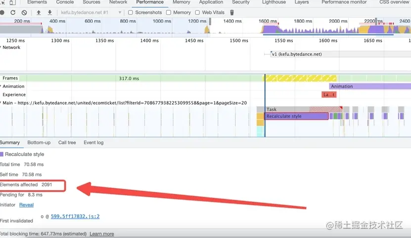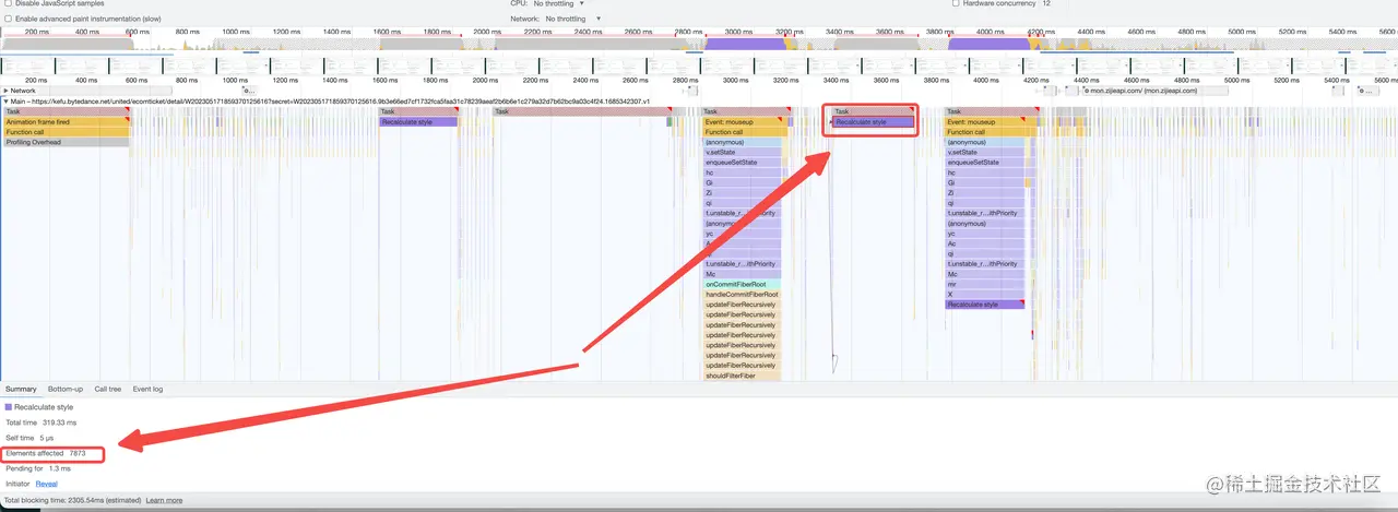 再手动将分页组件改为100页后,此段longtask明显从300ms缩短至100ms左右。剩余这个100ms,只能是表格加载时候Spin组件的loading态了,通过观察dom节点的变化,发现Spin组件loading态跟非loading态时,会更改wrap元素的class,此操作会引起Spin组件下所有节点的回流,所以有一段较长Recalculate Style,其中涉及到需要计算的节点为表格的所有子元素大约2000~3000多个,在注释掉search接口前的loading状态后,果然这段100ms的Recalculate Style的时间没了。