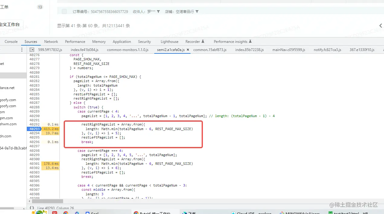 先看页数变化这段。根据火焰图,一点点找,找到一个在公司UI库中耗时较长的函数,此函数是UI库中的分页组件,构造分页筛选项数组时候所用。如下图,而我们列表页的总页数又特别多,线上动辄就是一百多万的分页,而这段代码又使用Array.from + 一个回调函数来构造一个 从5到一百多万的数组,如果是直接用for循环相信是没有这个问题的,大道至简没必要搞太多花里胡哨的操作。
