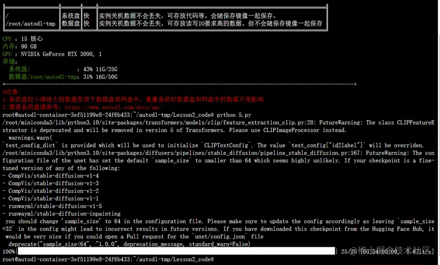 首先租用云端服务器(这里我使用的是autodl平台的3090显卡服务器,因为该服务器的显存较高,算力能够达到需求)将所需要的模型包和代码上传至云服务器,利用Stable Diffusion模型进行AI绘画,通过文本生成图片