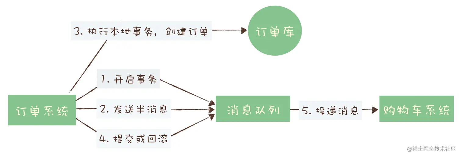 回到订单和购物车这个例子,我们一起来看下如何用消息队列来实现分布式事务。