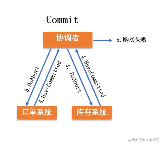 - 协调者向所有参与者发送“Abort”消息。