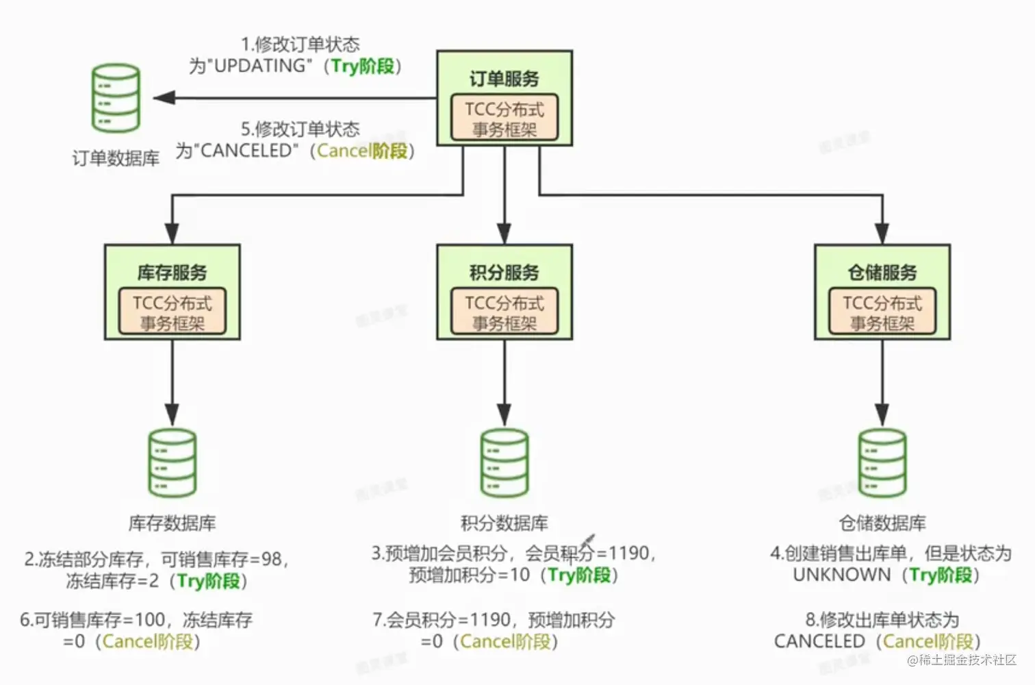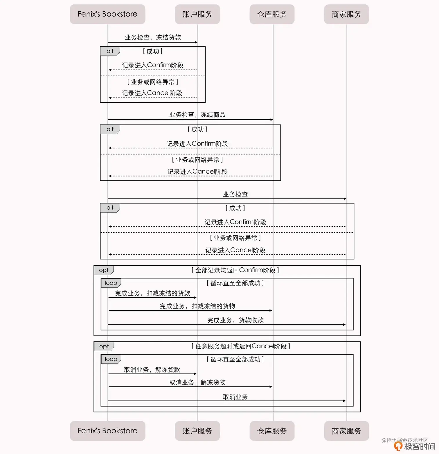 那么,根据 Fenix's Bookstore 在线书店的场景事例,TCC 的执行过程应该是这样的: