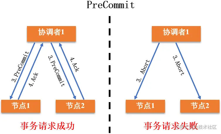 协调者根据参与者的回复情况,来决定是否可以进行 PreCommit 操作(预提交阶段)。