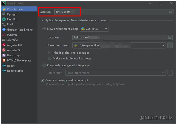 若对环境独立性要求很高,建议选择New environment using,若对环境独立性要求不高,可以选择Previously configured interpreter,导入安装python路径下的解释器,这样,第三方库或模块是在python路径下的文件夹里,达到多个项目共用第三方库或模块的效果。配置完成后,点击create即可创建新项目。