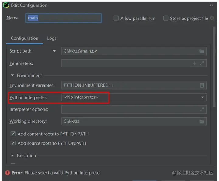 打开项目后,直接运行某个.py脚本(script)文件,若PyCharm没有检测到python interpreter(python解释器),会弹出下图所示的Edit Configuration编辑配置提示。