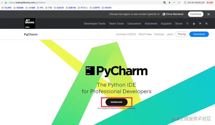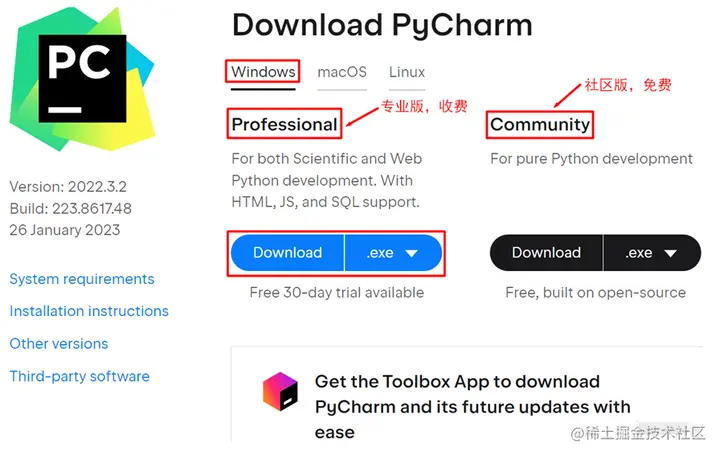 2.进入PyCharm的下载界面,选择对应的操作系统下载PyCharm安装程序。