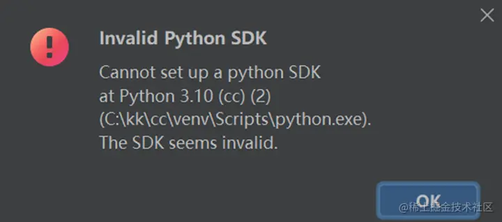 打开项目后,直接运行某个.py脚本(script)文件,若弹出下图所示的Invalid Python SDK提示,一般是python版本导致的,电脑没有安装这种python版本。SDK全称是Software Development Kit, 软件开发工具包,Python SDK是指python开发语言工具。