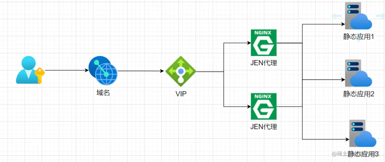 外网访问需满足如下图架构:VIP 后面挂 jen-nginx 来代理前端的主应用,jen 代理后面挂静态应用 1~N