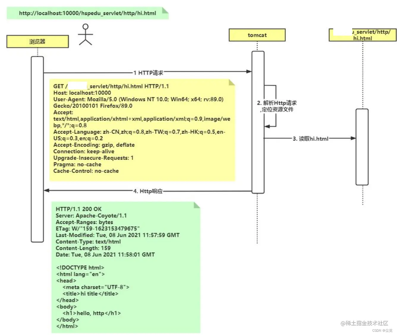 http 请求 hi.html 的 UML时序图