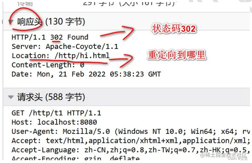 2) T1Servlet 返回 302 的状态码, 并且指定浏览器重定向到 hi.html