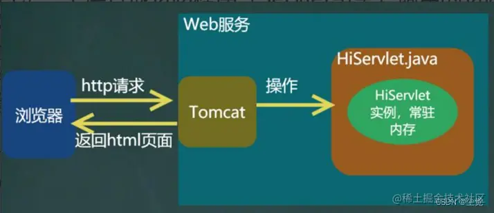 2. 针对浏览器的多次 Servlet 请求,通常情况下,服务器只会创建一个 Servlet 实例对象,也就是说 Servlet 实例对象一旦创建,它就会驻留在内存中,为后续的其它请求服务,直至web 容器退出/或者 redeploy 该 web 应用,servlet 实例对象才会销毁 【示意图】