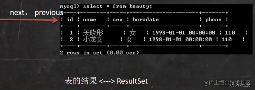 - next方法将光标移动到下一行,并且由于在ResultSet对象中没有更多行时返回false,因此可以在while循环中使用循环来遍历结果集