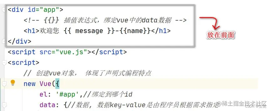 3. {{message}}这种叫插值表达式 只能在标签内使用