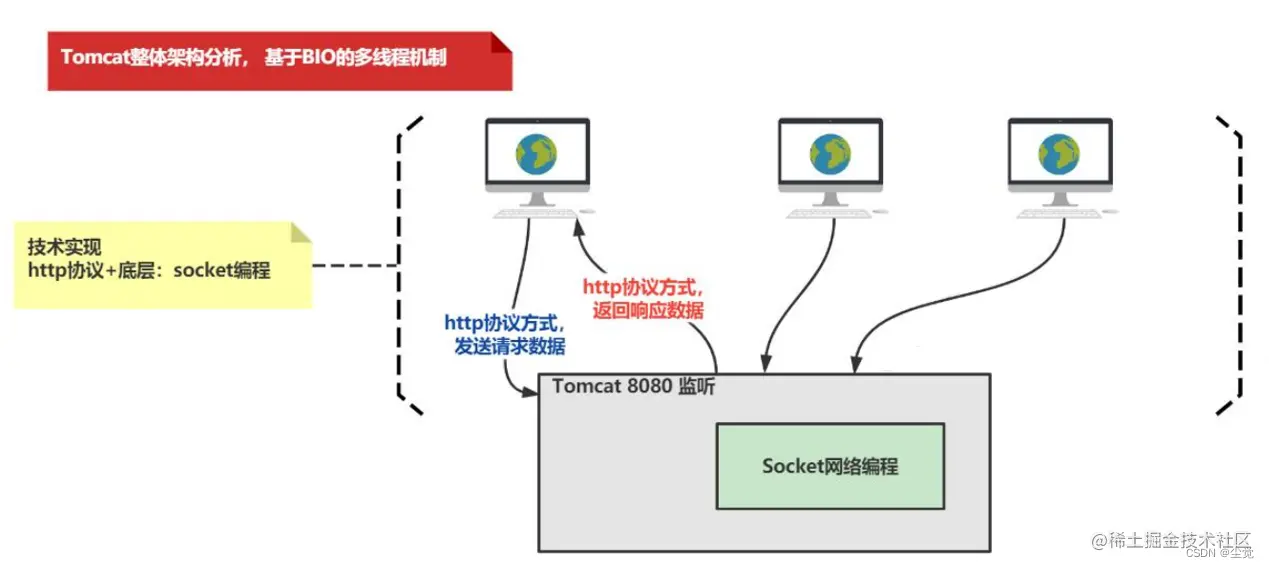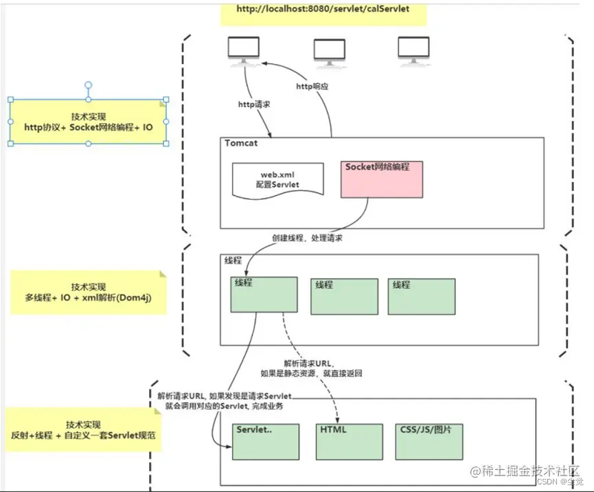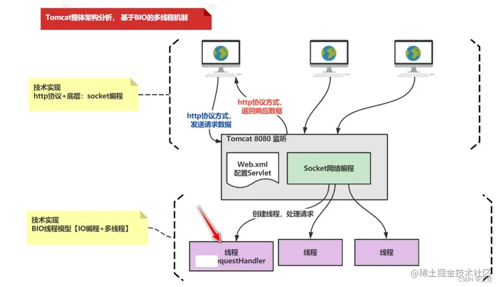 收客户端请求,解析请求, 调用 Servlet , 并返回结果的机制流程, 采用 BIO 线程模型来模拟.