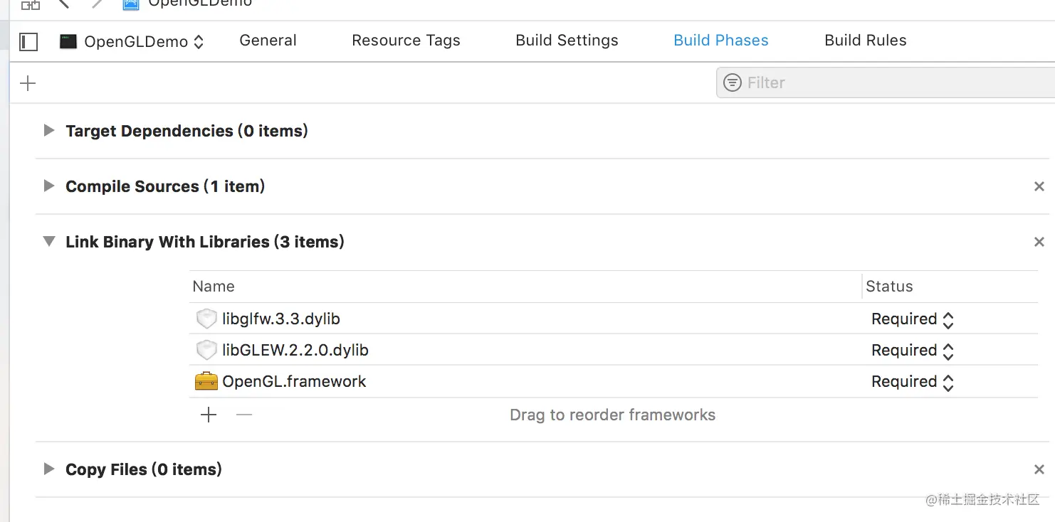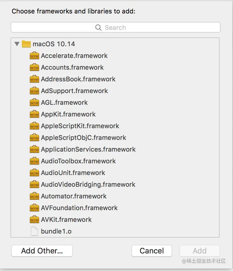 点击加号(+)按钮,在弹窗中,搜索OpenGL,可以找到OpenGL.framework库并并进行添加