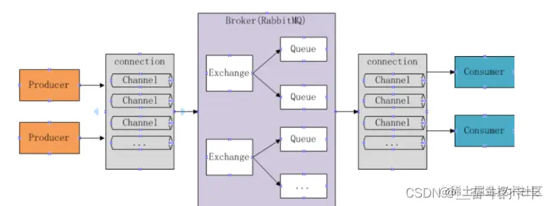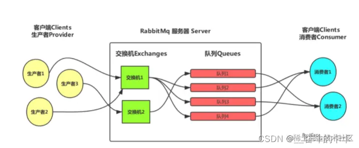 黄色的圈圈就是我们的消息推送服务,将消息推送到 中间方框里面也就是 rabbitMq的服务器,然后经过服务器里面的交换机、队列等各种关系将数据处理入列后,最终右边的蓝色圈圈消费者获取对应监听的消息。