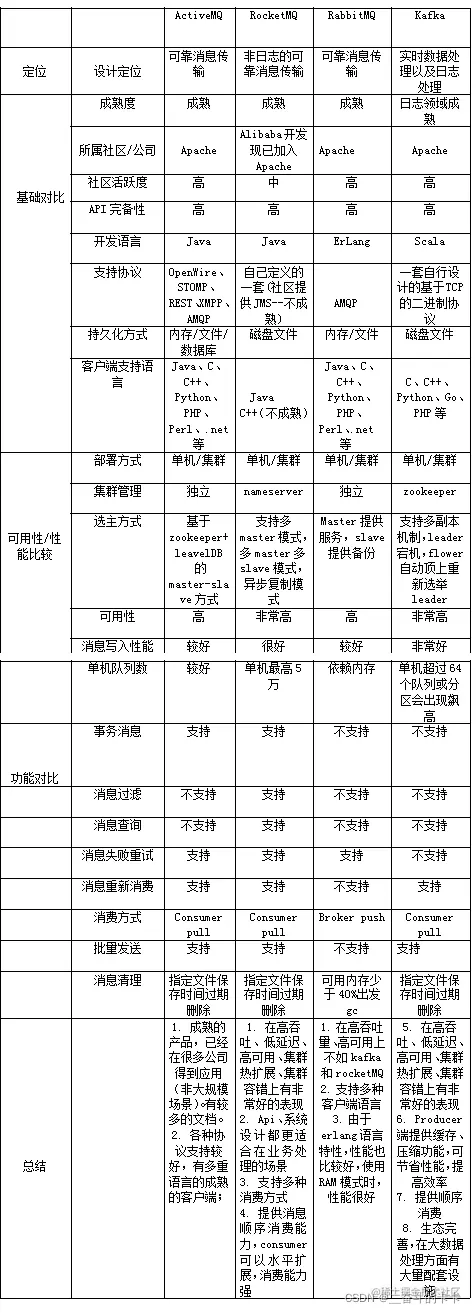 3、RocketMQ,它的特点非常好。它高性能、满足可靠性、分布式事物、支持水平扩展、上亿级别的消息堆积、主从之间的切换等等。MQ的所有优点它基本都满足。但是它最大的缺点:商业版收费。因此它有许多功能是不对外提供的。
