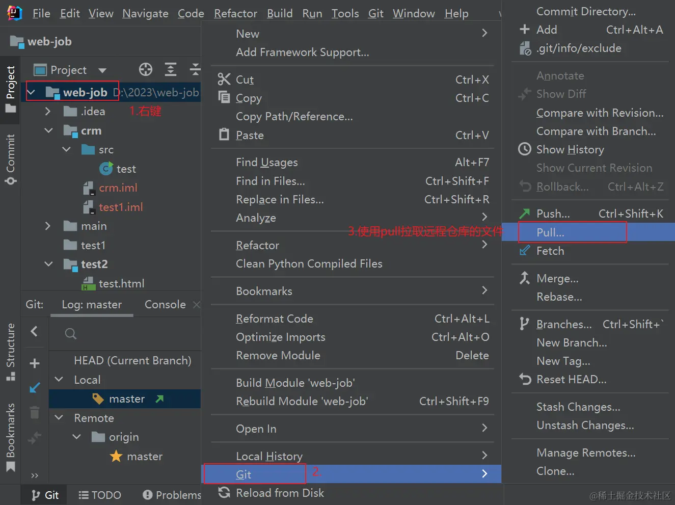 git pull命令拉取,或者使用图形化界面拉取