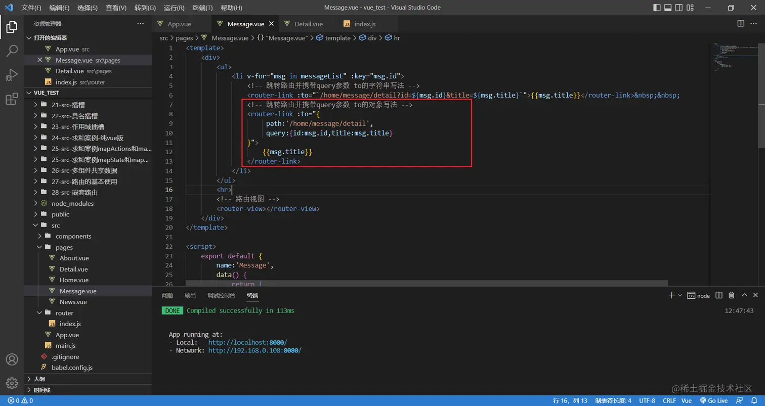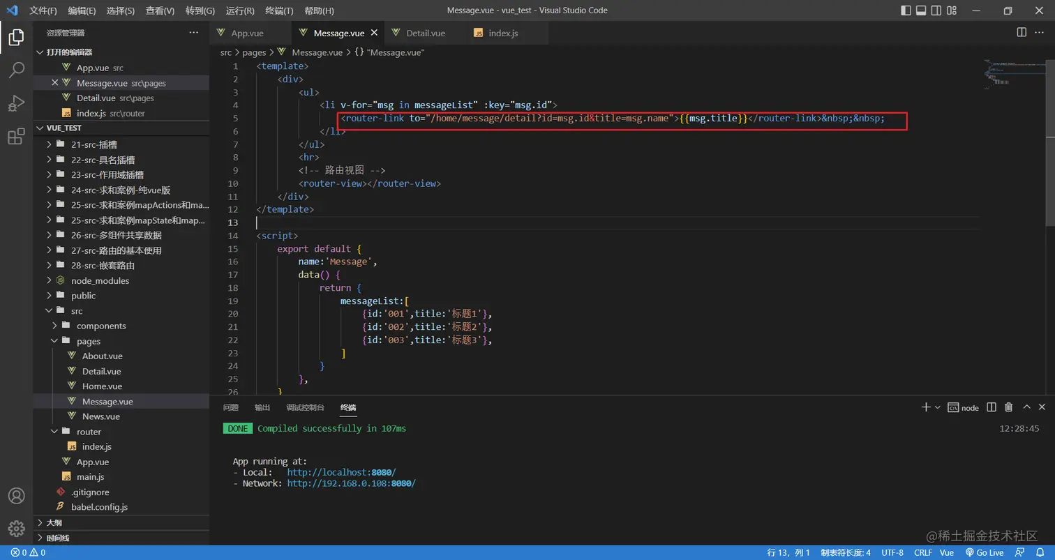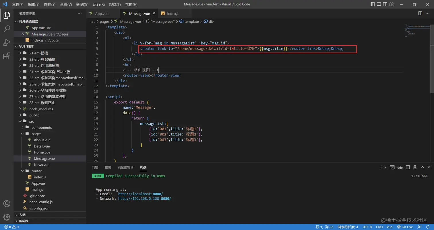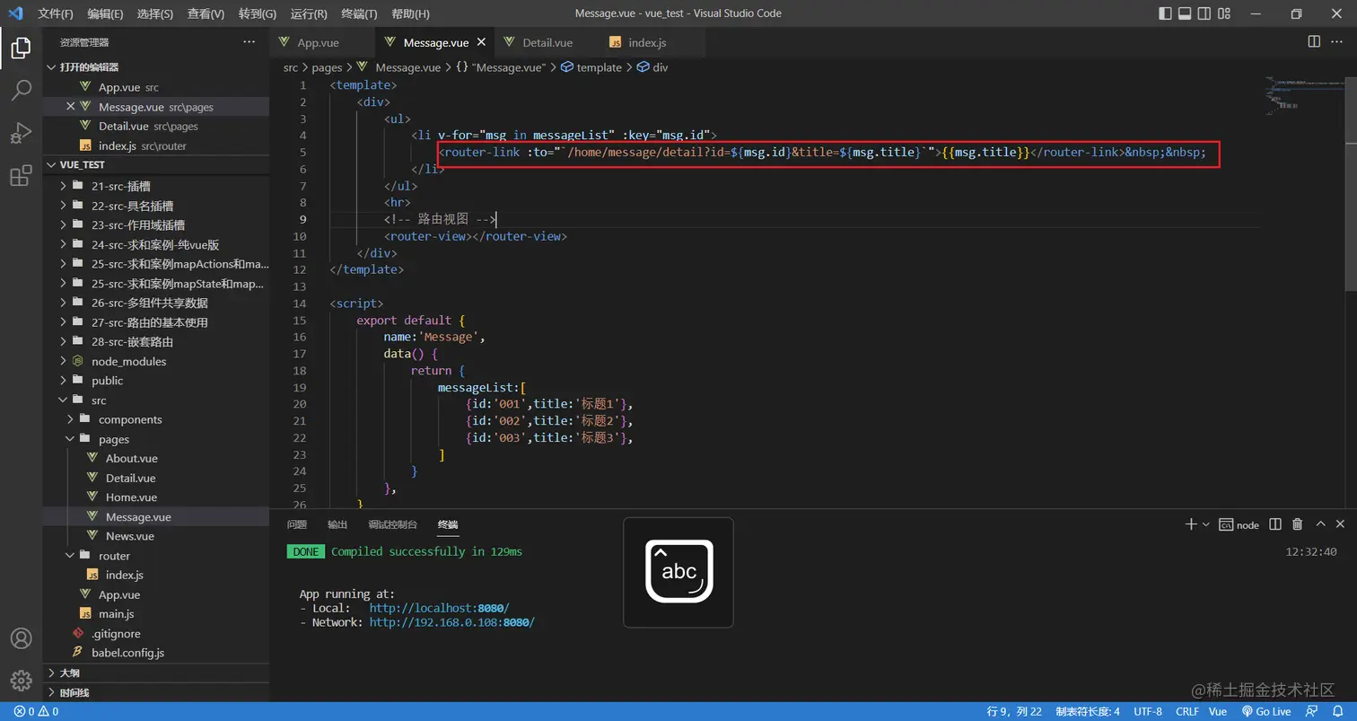 <router-link to="/home/message/detail?id=1&title=你好">