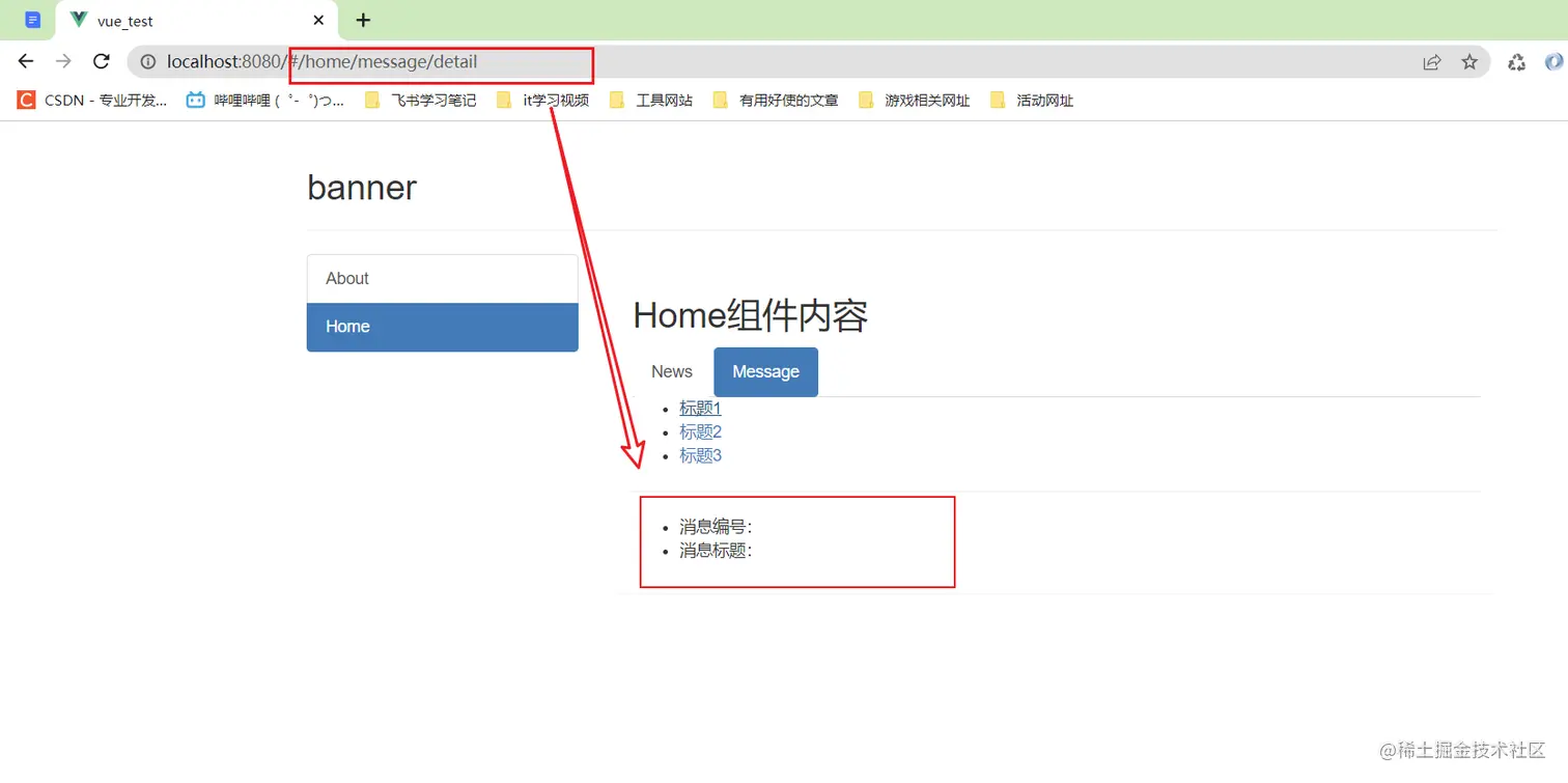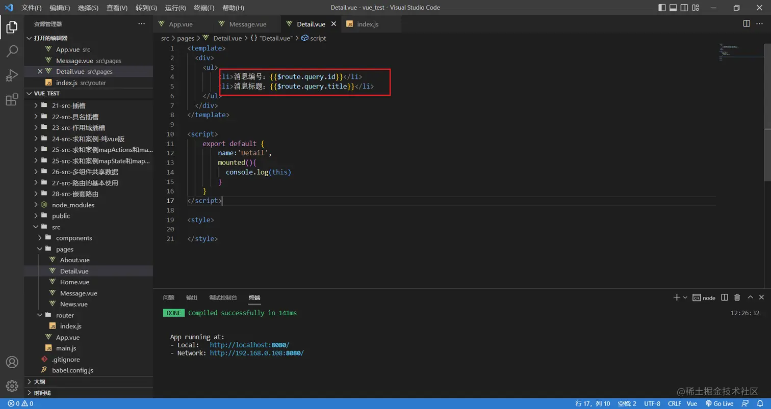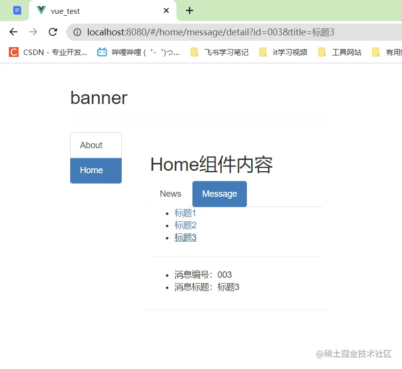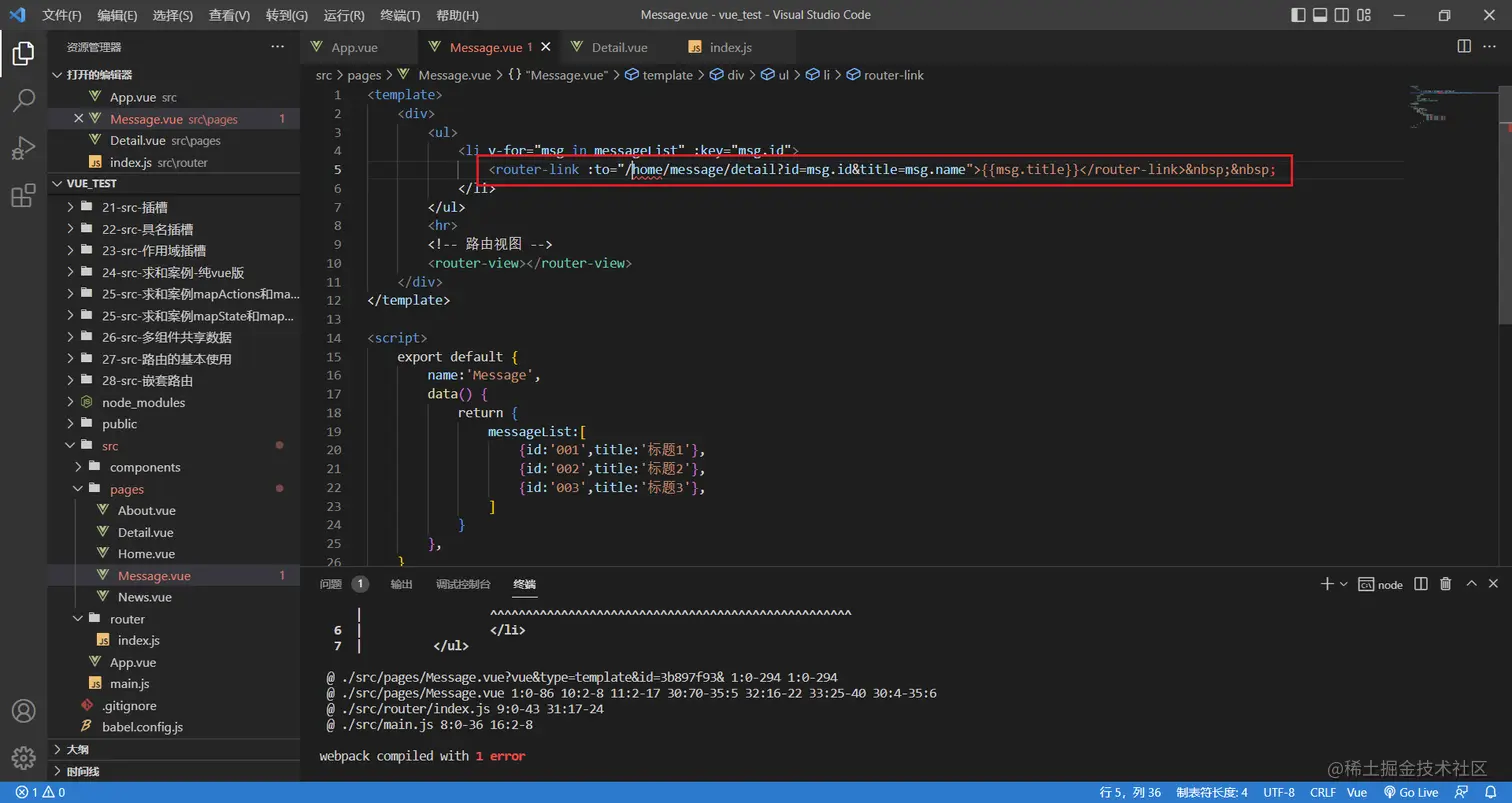 <router-link to="/home/message/detail?id=1&title=你好">