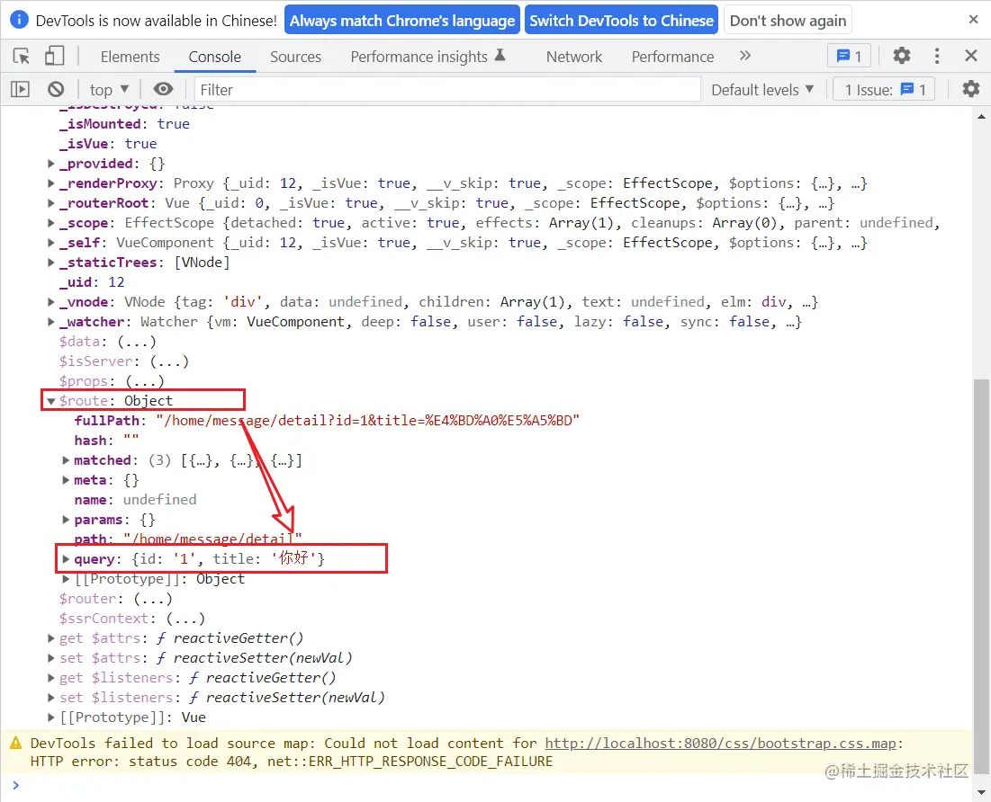 传递完的参数就到$route的query里面,这里我在组件挂载的时候输出了一个vc实例