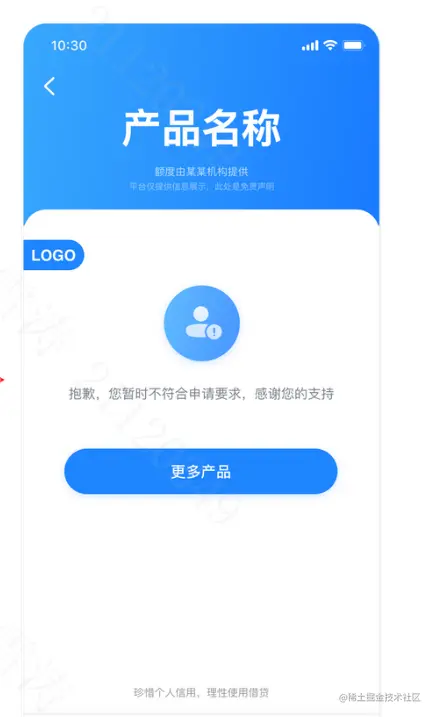 图中客户授信被拒绝了,但是平台出现了更多产品按钮,意味着客户可以选择其它贷款产品,一般是引流给其他放款渠道。