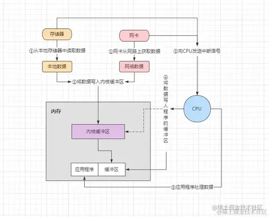 - CPU 将内核中的数据写入到对应的程序缓冲区或网络 Socket 接收缓冲区中。