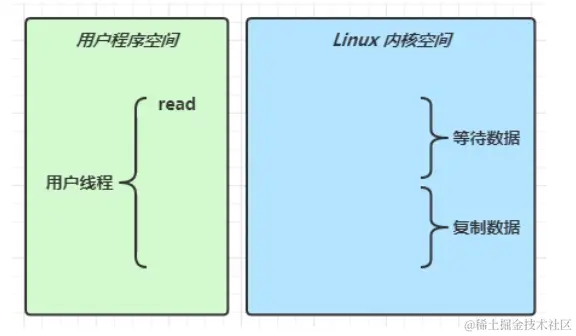 当调用一次 channel.read 或 stream.read 后,会切换至操作系统内核来完成真正的数据读取,而读取又分为两个阶段,分别为: