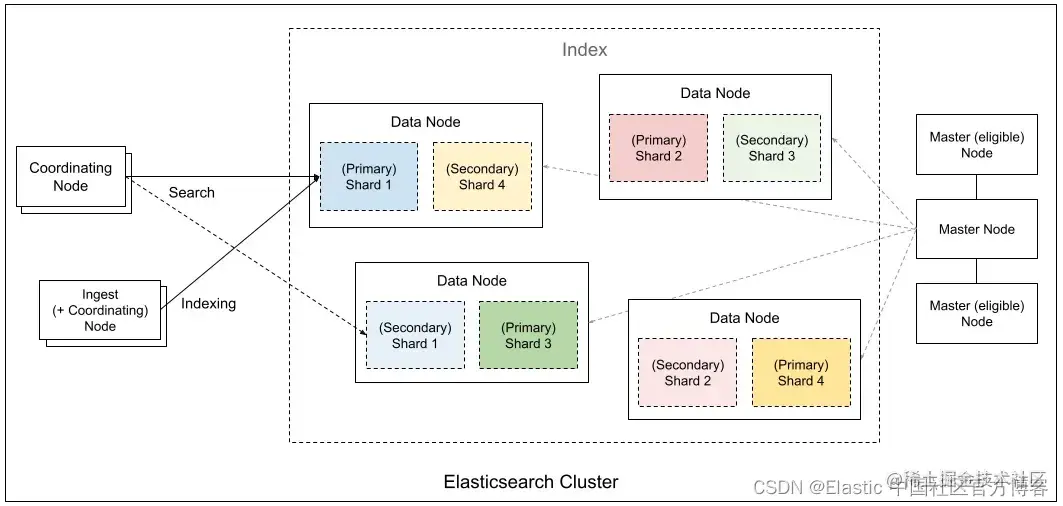 当数据被添加到集群时,它被索引并存储在一个或多个数据节点上。 Elasticsearch 使用前面提到的分片技术将数据分布在多个节点上,增强了性能和可扩展性。
