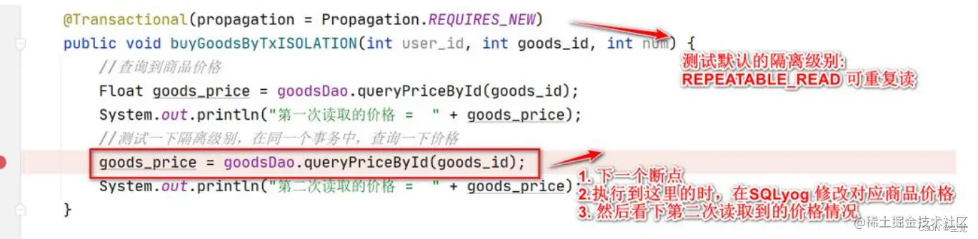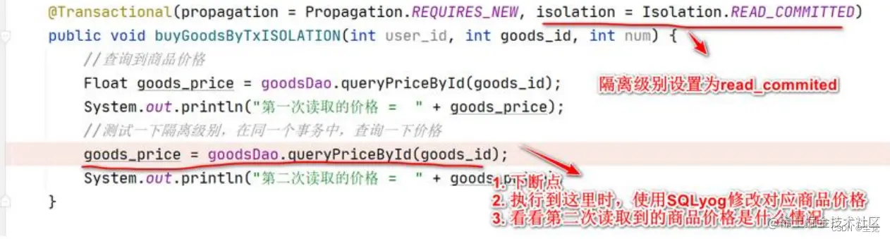 使用前面已经创建好的测试方法, 在 READ_COMMITTED 隔离级别 下, 两次 读取到的价格会受到 SQLyog 修改