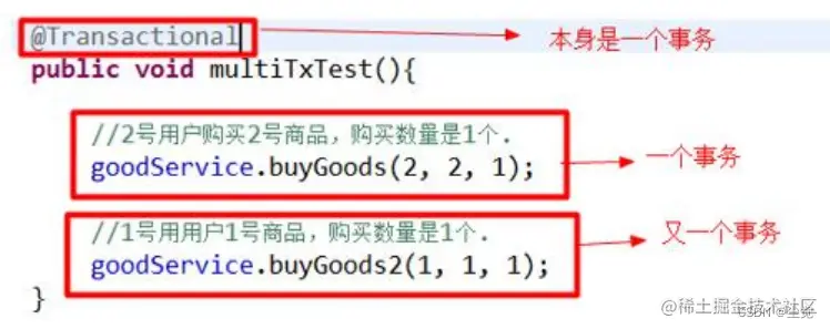 即会当做一个整体事务进行管理 , 比如buyGoodsByTx方法成功,但是buyGoodsByTx2() 失败,会造成 整个事务的回滚 即会回滚buyGoodsByTx