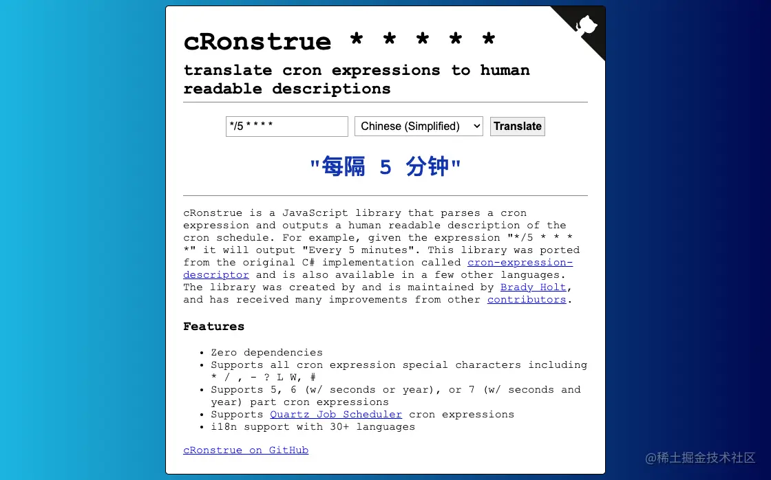 一个将 Cron 指令转化可读文本的工具,该工具零依赖很轻量,且有超过 30 种语言的国际化支持。