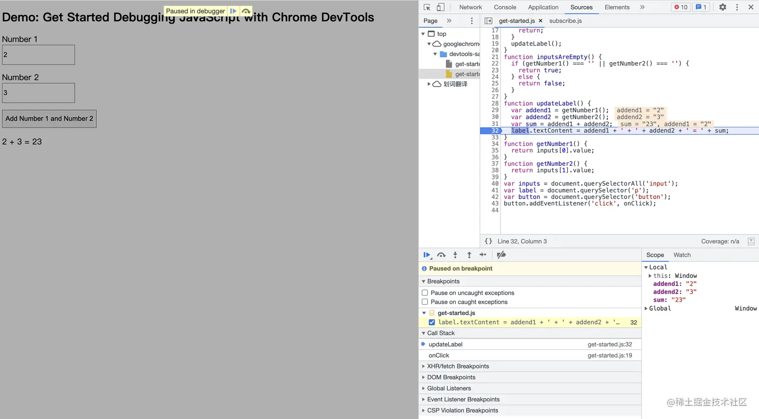 Sourcestab下,按esc可以将Console调出来。Console除了可以查看报错信息外,还可以在当前执行上下文中进行变量的操作。比如此时就可以使用变量addend1、addend2、sum的值,因为代码在 32 行之前暂停,处于updateLabel()的上下文环境中,这时这些变量是存在的。之后输入如下代码: -