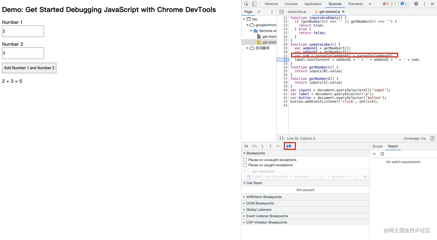 代码编辑区,将 31 行的代码var sum = addend1 + addend2;用var sum = parseInt(addend1) + parseInt(addend2)代替,然后按 Command + S (Mac) 或 Control + S(Windows、Linux)保存更改。 - 点击第四步中截图里的序号 6(Activate/Deactivate breakpoints),发现它高亮起来了,说明此时所有的断点都被禁用,代码不会暂停了。