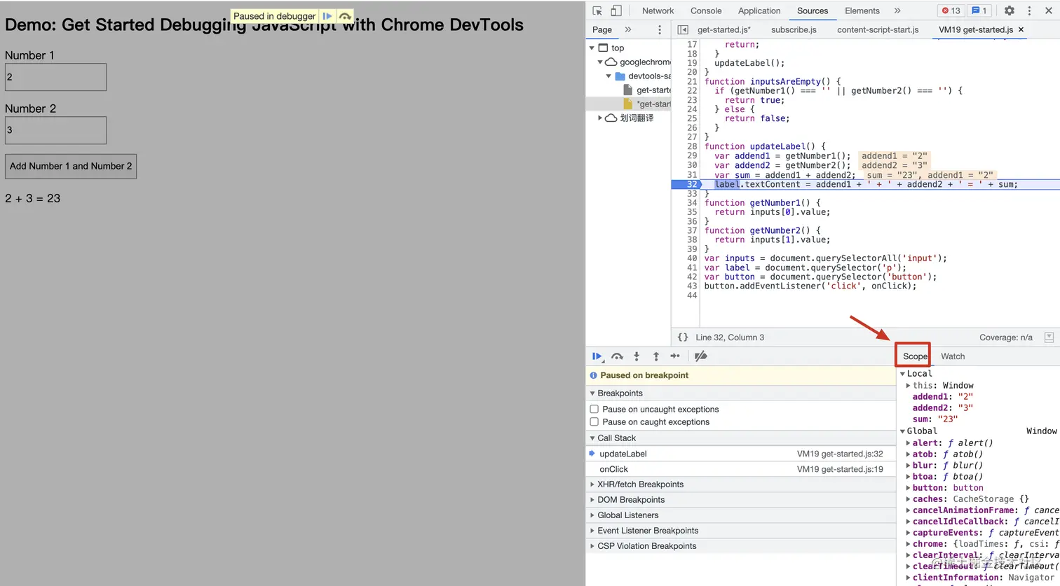 根据上面第五步中代码最右侧的表达式的值可以发现,变量 addend1、addend2、sum的值用引号括起来了,说明它被评估为了 string 类型。现在我们找到了产生bug 的原因,结果应该是 number 类型。以下是开发者工具提供的检查变量的方式: