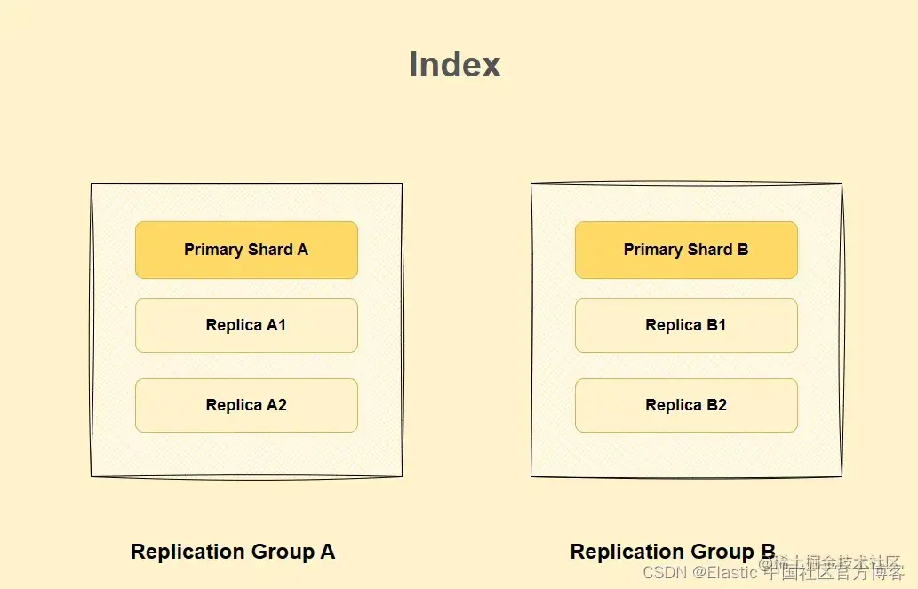 因此,索引包含分片,而分片又可能包含副本分片。 在此示例中,一个索引已拆分为两个主分片,每个主分片有两个副本分片。 因此,该索引包含两个复制组。