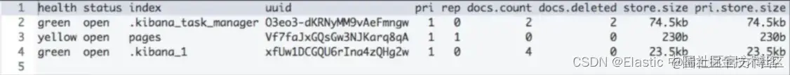 现在你知道了我们的集群处于黄色状态的原因,让我们再次查看索引列表,因为我想向你展示最后一件事。
