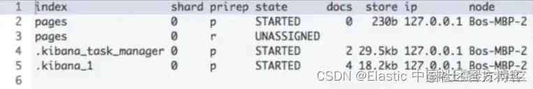 结果显示每个分片的列表以及关于它的各种信息,包括它属于哪个索引。 在顶部,我们可以看到新创建的索引有两个分片,一个是主分片,一个是副本分片。