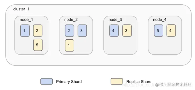 如果我们随后向集群添加一个额外的节点,我们会看到副本分片会分散开来进一步提高可用性。 在那种情况下,即使两个节点同时宕机,我们也不会丢失任何数据。