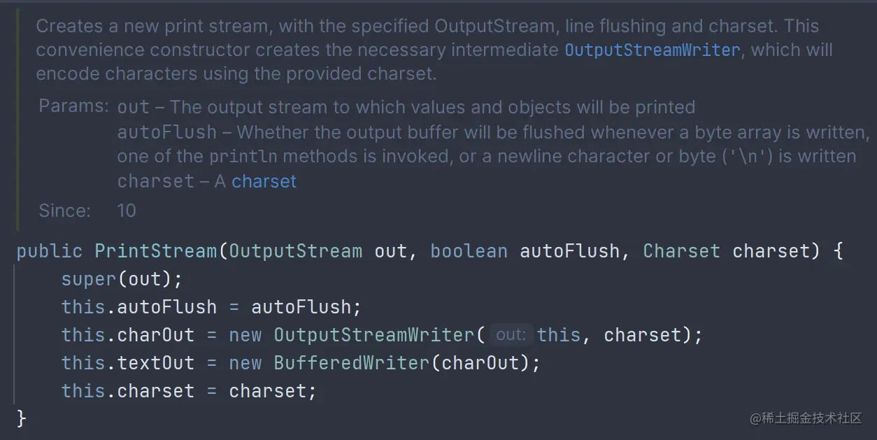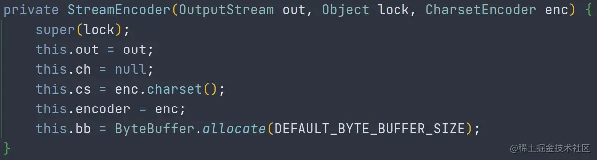 在创建PrintStream对象时,先将FileOutputStream封装成BufferedOutputStream,然后把BufferedOutputStream封装成OutputStreamWriter。这一步中会根据传入的字符集创建OutputStreamWriter中的编码器StreamEncoder