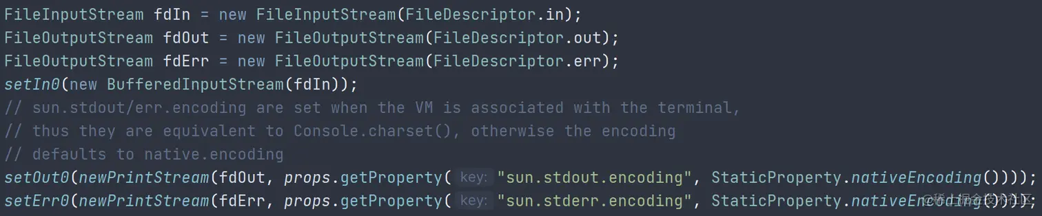 发现它用FileDescriptor.out创建了FileOutputStream对象,再用这个对象创建了PrintStream对象,最后调用native的setOut0