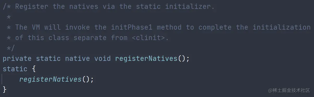 从System类的注释中发现,VM会调用initPhase1这个方法来初始化这个类。先不管VM,先看下initPhase1方法做了什么