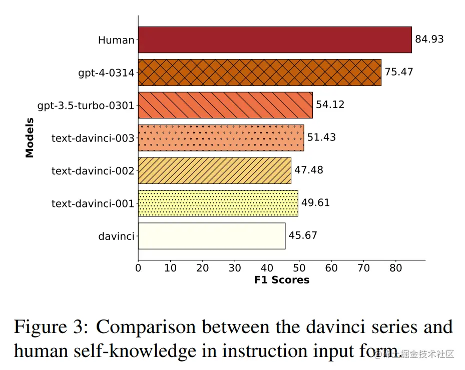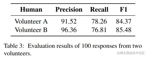 分别使用 SimCSE 计算大模型回答与这 16 种不确定语料的相似度,如果相似度超过某一阈值,则认为大模型表达了不确定性,承认了自己“无知”,最后使用 F1 分数作为综合打分,代表大模型的自知能力。同时,为了以人类作为一个对照,作者又邀请了两位志愿者使用 SelfAware 数据集对人类的自知能力进行了评估,得到了 84.93% 的结果: